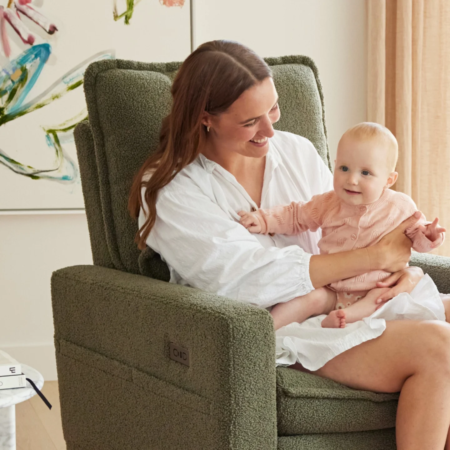 Our Frankie Teddy Nursery Chair in this elegant olive not only offers plush comfort but also makes a stylish statement with its fusion of design and functionality in a nursery chair.