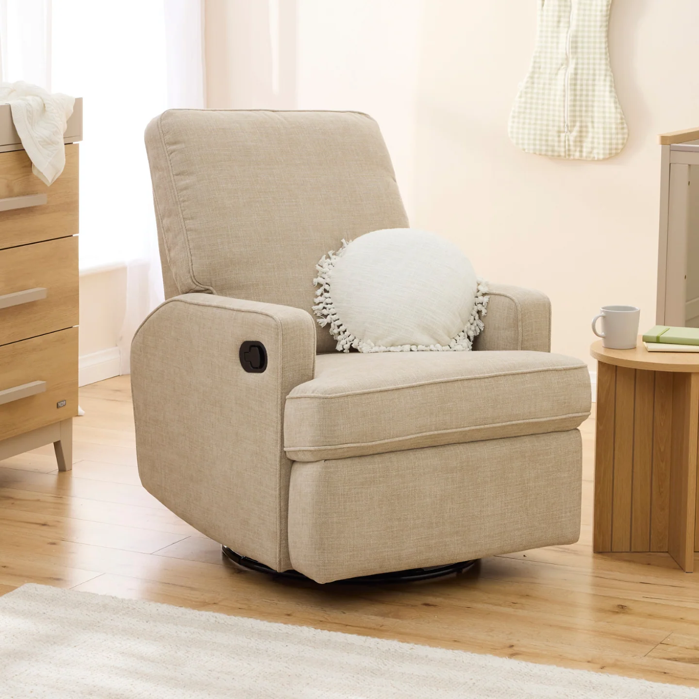 The Quinn’s glider & recliner is one of our most dreamiest of chairs. It boasts a wide, cushioned back for both neck and back support. When we say 'cushioned' we mean as soft as a cloud, giving your body more relief to rest after long nights, all while giving you the support you need when feeding your baby.